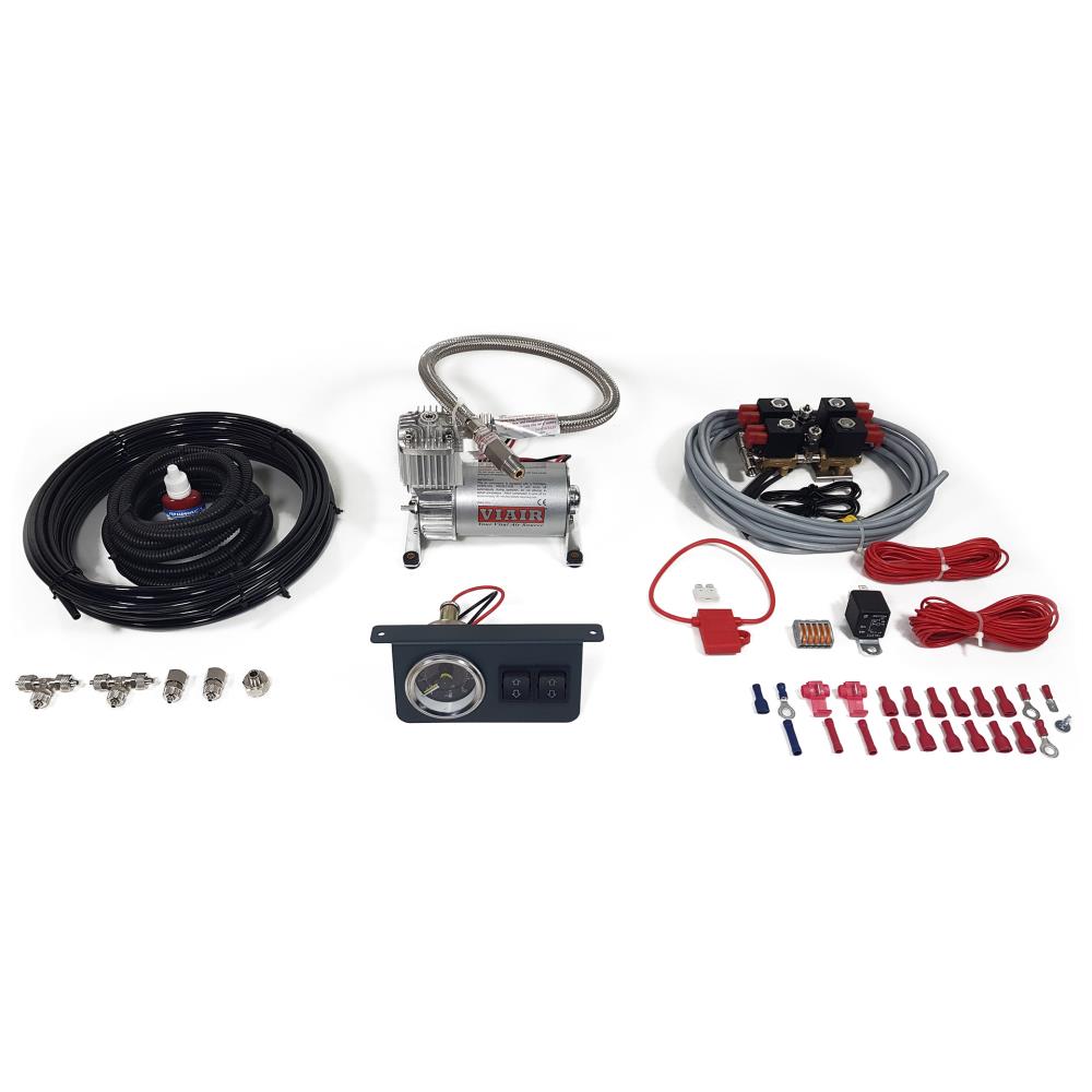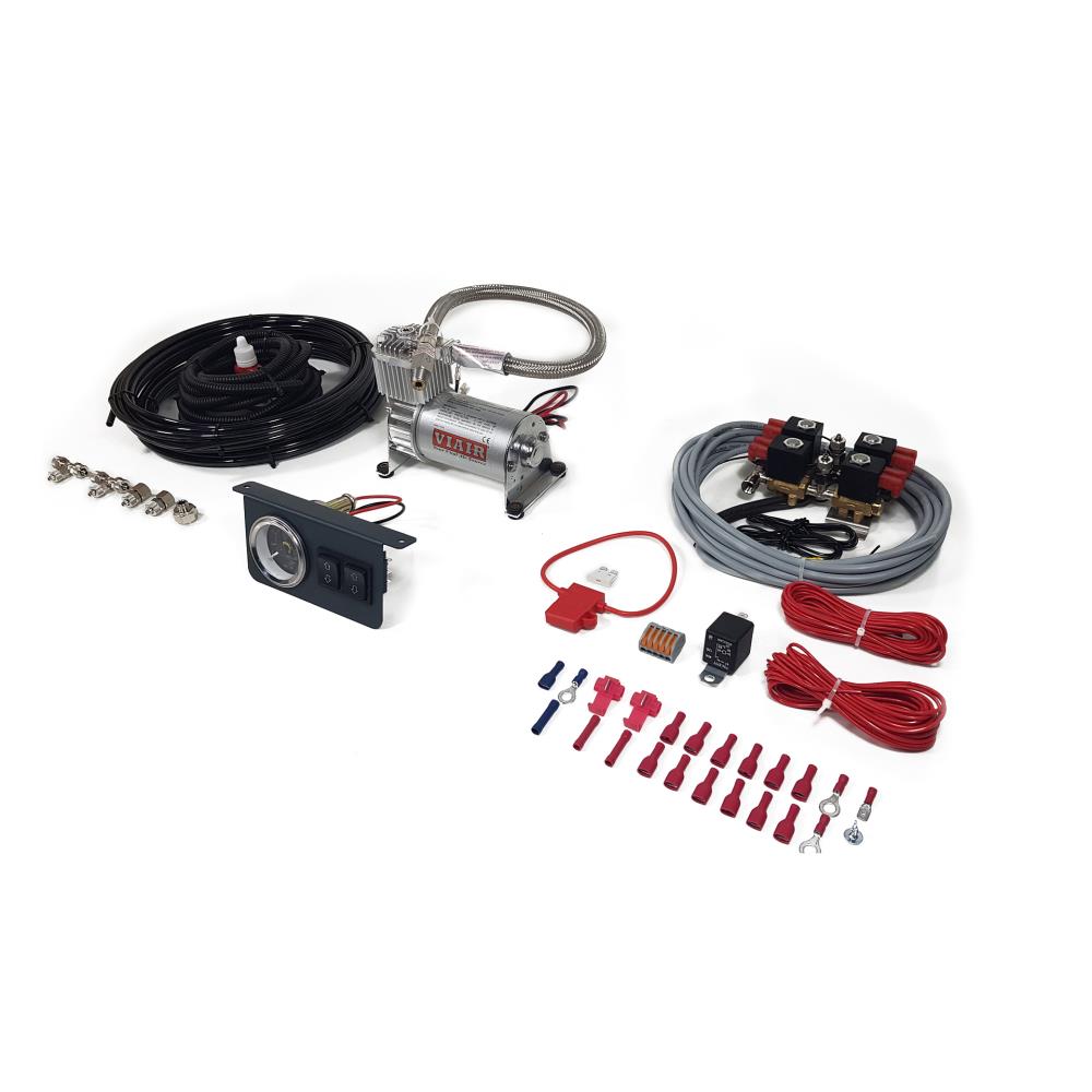 Компрессор, блок электромагнитных клапанов, манометр двухстрелочный, 2 электроклавиши, панель крепления манометра и клавиш, электропроводка, комплектующие для монтажа, инструкция.