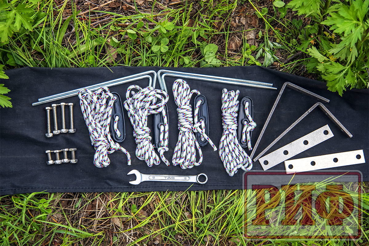 Установка тента под силу даже одному человеку и занимает не более двух-трех минут. В комплект входят веревочные растяжки с возможностью регулировки натяжения и металлические колья для крепления к грунту.