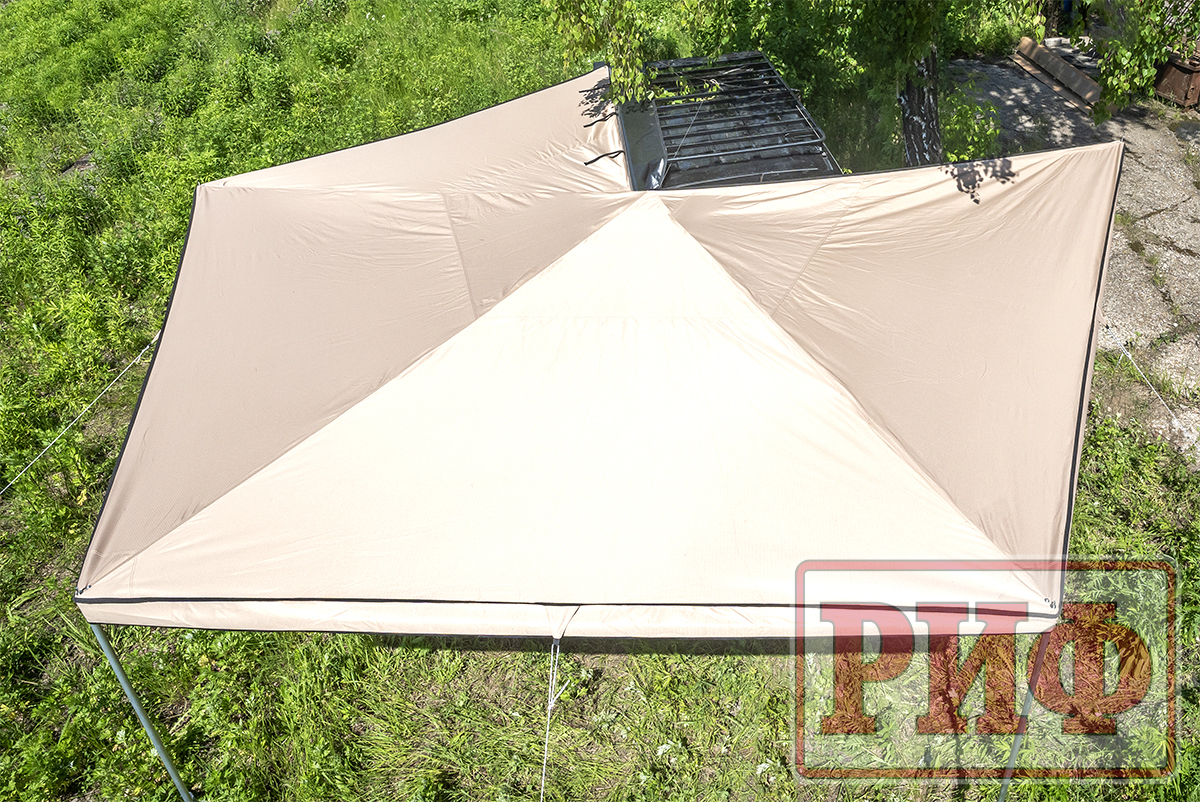 Размер тента в рабочем состоянии: 2,5 метра по стороне, которая крепится к автомобилю и 3 метра по вылету. Такой тент позволяет с комфортом разместить рядом с автомобилем 5-6 человек.